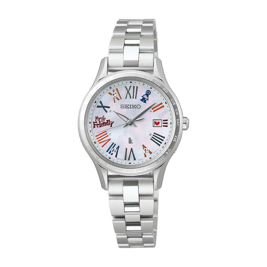 <セイコー ルキア>は、1995年の誕生以来、時代に寄り添う心地よいデザインで、自分らしさを大切にする女性たちのライフスタイルを彩り続け、2025年にブランド誕生30周年を迎えました。この記念すべき節目に、「身に着ける人が日々を楽しみながら、ハッピーで前向きな気持ちで前向きに進んでいけるように」という想いを込めたコラボレーションが実現しました。 MR. FRIENDLYとは 1988年に“友達と仲良くしようね”というコンセプトをもったソシアルキャラクターとして誕生。「世界中のひとびとにハッピーを届けたい!人間も、動物も、樹木や植物も、すべての自然が仲良しでいたい!」という想いのもと、見ればやさしい気持ちになれるその表情と